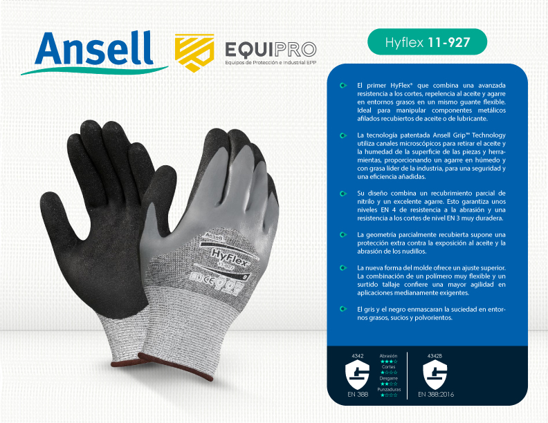 Descripción: El primer HyFlex® que combina una avanzada resistencia a los cortes, repelencia al aceite y agarre en entornos grasos en un mismo guante flexible. Ideal para manipular componentes metálicos afilados recubiertos de aceite o de lubricante. La tecnología patentada Ansell Grip™ Technology utiliza canales microscópicos para retirar el aceite y la humedad de la superficie de las piezas y herramientas, proporcionando un agarre en húmedo y con grasa líder de la industria, para una seguridad y una eficiencia añadidas.
