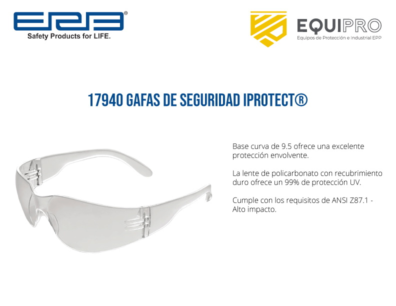 Descripción: Base curva de 9.5 ofrece una excelente protección envolvente. La lente de policarbonato con recubrimiento duro ofrece un 99% de protección UV. Cumple con los requisitos de ANSI Z87.1 – Alto impacto.