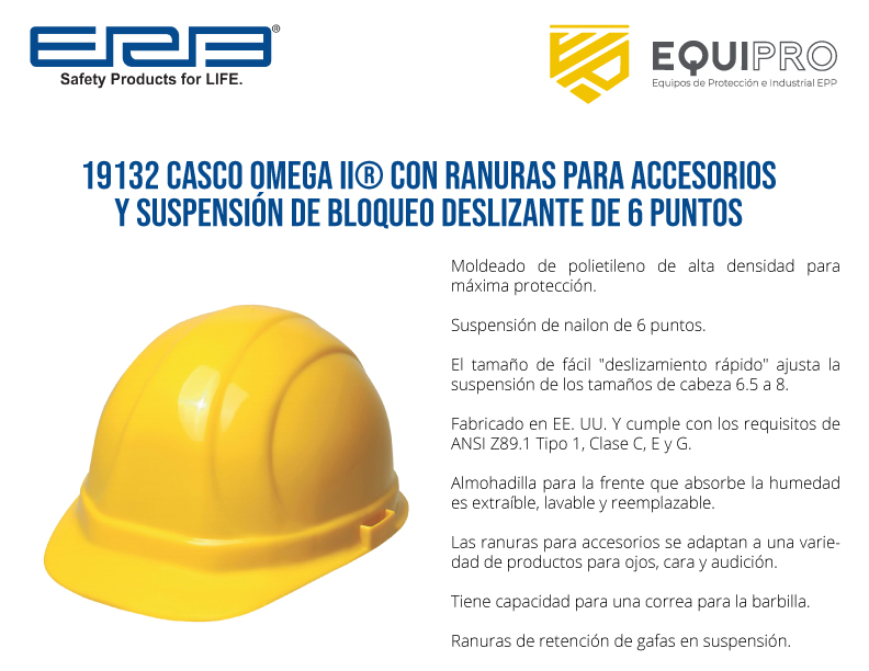 Descripción: Moldeado de polietileno de alta densidad para máxima protección. Suspensión de nailon de 6 puntos. El tamaño de fácil «deslizamiento rápido» ajusta la suspensión de los tamaños de cabeza 6.5 a 8. Fabricado en EE. UU. Y cumple con los requisitos de ANSI Z89.1 Tipo 1, Clase C, E y G.