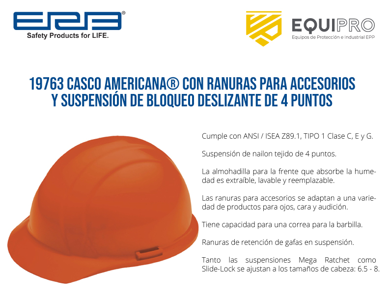 Descripción: Cumple con ANSI / ISEA Z89.1, TIPO 1 Clase C, E y G. Suspensión de nailon tejido de 4 puntos. La almohadilla para la frente que absorbe la humedad es extraíble, lavable y reemplazable.