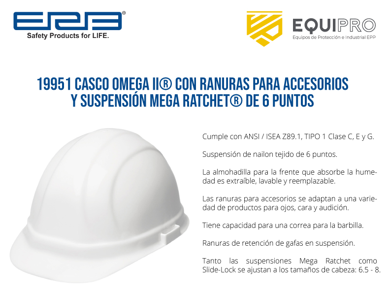 Descripción: Cumple con ANSI / ISEA Z89.1, TIPO 1 Clase C, E y G. Suspensión de nailon tejido de 6 puntos. La almohadilla para la frente que absorbe la humedad es extraíble, lavable y reemplazable.