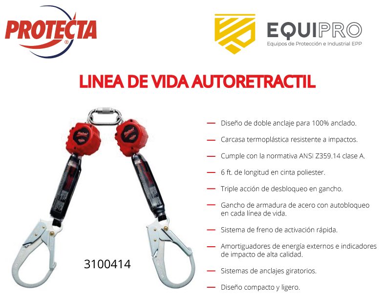 Descripción: Diseñado para remates a nivel de los pies y aplicaciones de bordes afilados. Diseño de doble pernera 100% rematado. Conector incorporado para conexión directa de SRL de dos piernas al arnés. Líneas de vida de dos patas de 8 pies (2,4 m) con línea de vida de cable de acero galvanizado de 3/16 «(5 mm).