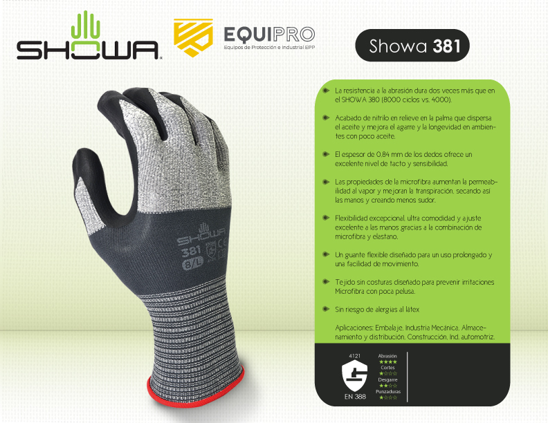 Descripción: La resistencia a la abrasión dura dos veces más que en el SHOWA 380 (8000 ciclos vs. 4000). Acabado de nitrilo en relieve en la palma que dispersa el aceite y mejora el agarre y la longevidad en ambientes con poco aceite. El espesor de 0,84 mm de los dedos ofrece un excelente nivel de tacto y sensibilidad.