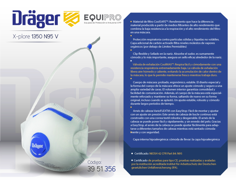 Descripción: Material de filtro CoolSAFETM: Rendimiento que hace la diferencia: material producido a partir de medios filtrantes de alto rendimiento que combina la baja resistencia a la respiración y el alto rendimiento del filtro en una máscara.