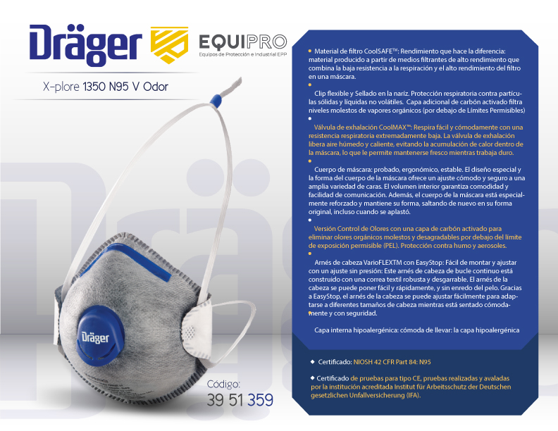 Descripción: Material de filtro CoolSAFETM: Rendimiento que hace la diferencia: material producido a partir de medios filtrantes de alto rendimiento que combina la baja resistencia a la respiración y el alto rendimiento del filtro en una máscara.