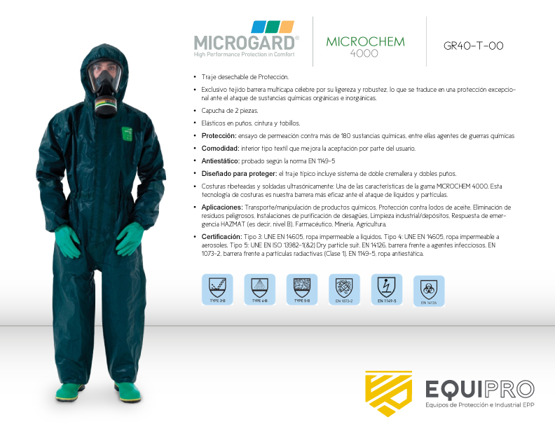 Descripción: Traje desechable de Protección. Exclusivo tejido barrera multicapa célebre por su ligereza y robustez, lo que se traduce en una protección excepcional ante el ataque de sustancias químicas orgánicas e inorgánicas. Capucha de 2 piezas. Elásticos en puños, cintura y tobillos. Protección: ensayo de permeación contra más de 180 sustancias químicas, entre ellas agentes de guerras químicas. Comodidad: interior tipo textil que mejora la aceptación por parte del usuario.