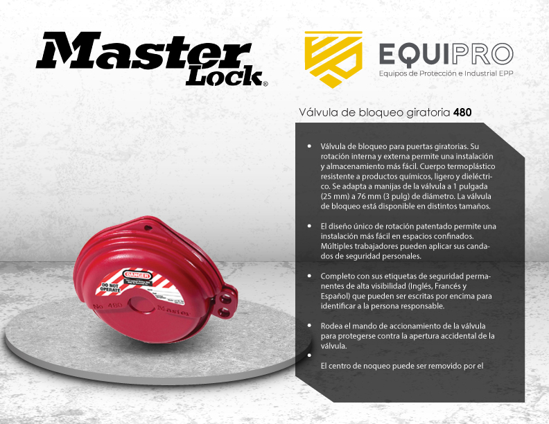 Descripción: Válvula de bloqueo para puertas giratorias. Su rotacióninterna y externa permite una instalación y almacenamiento más fácil. Cuerpo termoplástico resistente a productos químicos, ligero y dieléctrico. Se adapta a manijas de la válvula a 1 pulgada (25 mm) a 76 mm (3 pulg) de diámetro. La válvula de bloqueo está disponible en distintos tamaños.
