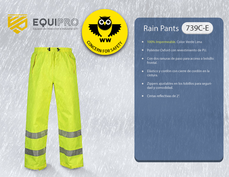 Descripción: 100% Impermeable. Color: Verde Lima Poliéster Oxford con revestimiento de PU. Con dos ranuras de paso para acceso a bolsillo frontal. Elástico y cordón con cierre de cordón en la cintura.
