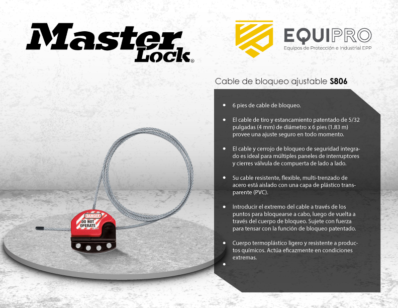 Descripción: 6 pies de cable de bloqueo. El cable de tiro y estancamiento patentado de 5/32 pulgadas (4 mm) de diámetro x 6 pies (1.83 m) provee un ajuste seguro en todo momento. El cable y cerrojo de bloqueo de seguridad integrado es ideal para múltiples paneles de interruptores y cierres válvula de compuerta de lado a lado.